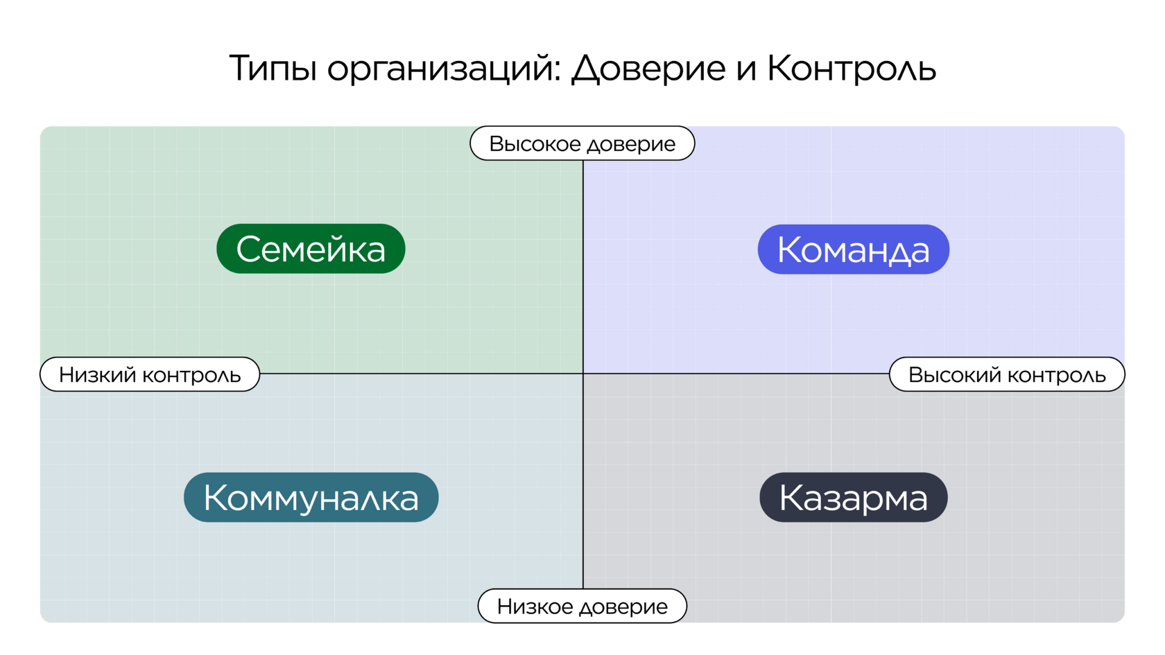Опираясь на сочетание доверия и контроля, Марина Мелия выделяет четыре типа организаций.